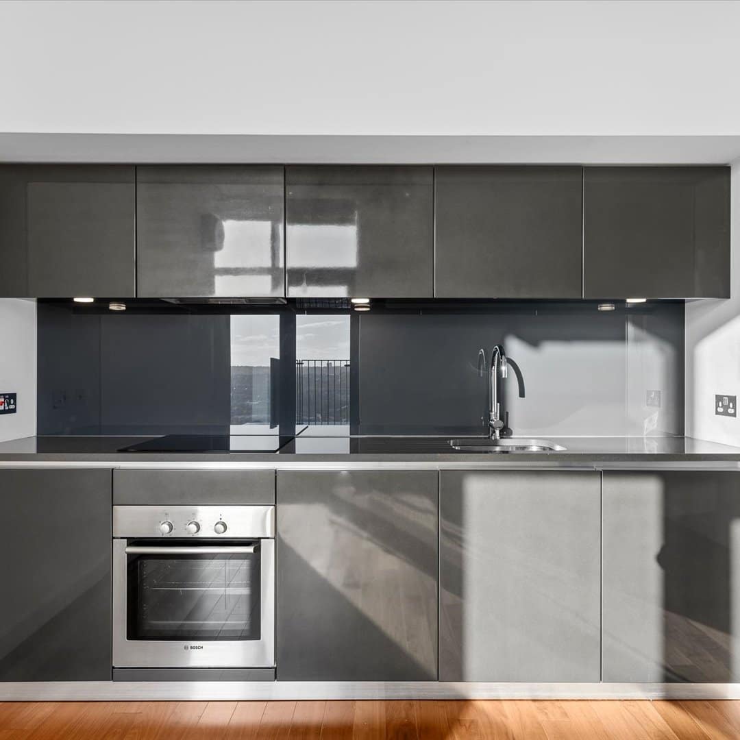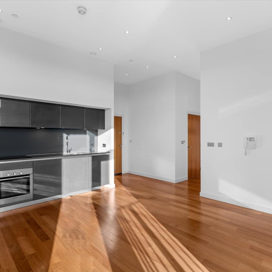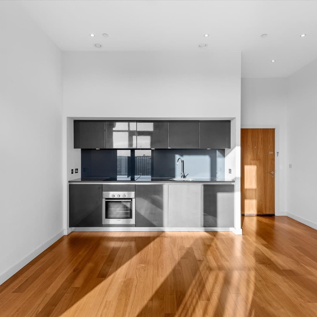 Featuring floor-to-ceiling windows, the spacious open-plan living area is bathed in natural light and boasts high-quality laminate flooring, creating a sleek and modern aesthetic. The contemporary kitchen is fully fitted with integrated appliances, offering both functionality and elegance.