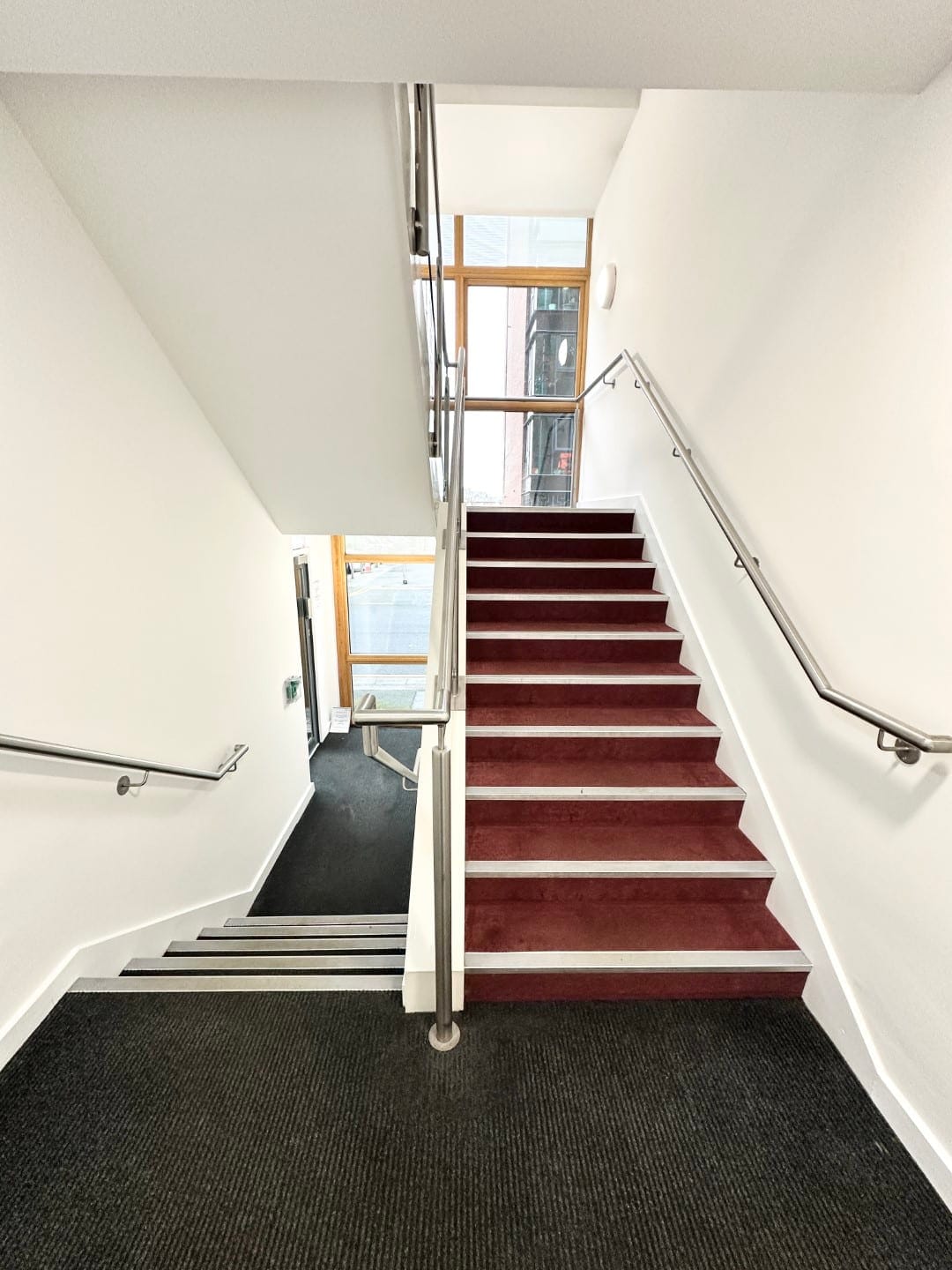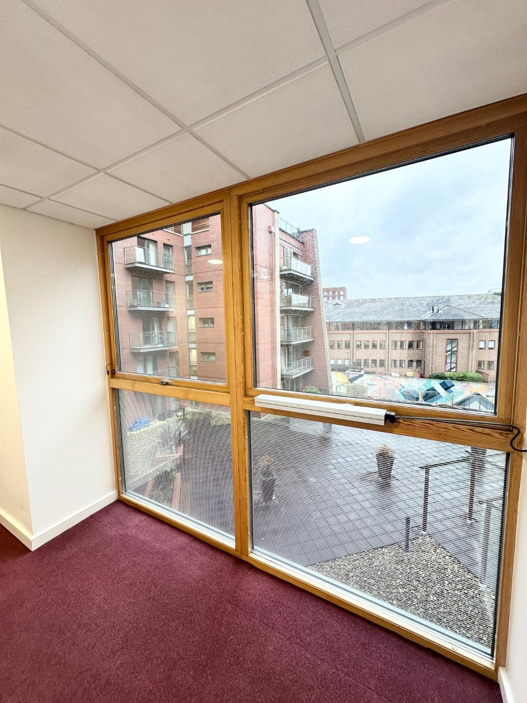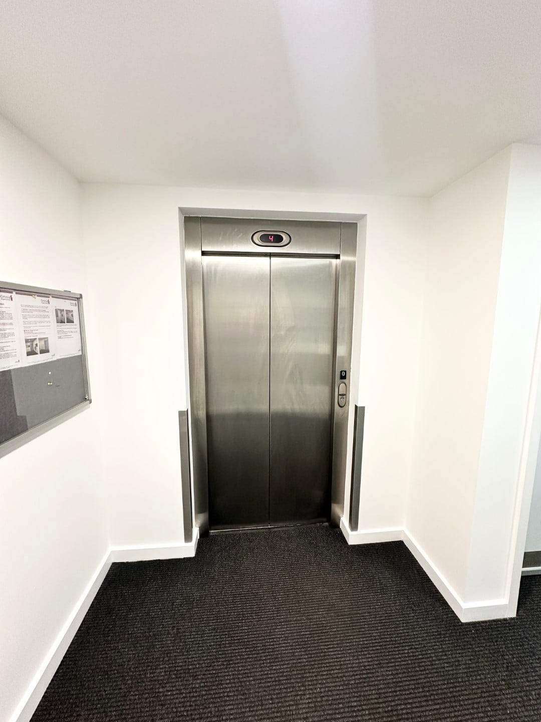 Located on an upper floor with lift access, the property benefits from secure intercom entry and a private balcony overlooking a contemporary courtyard setting.